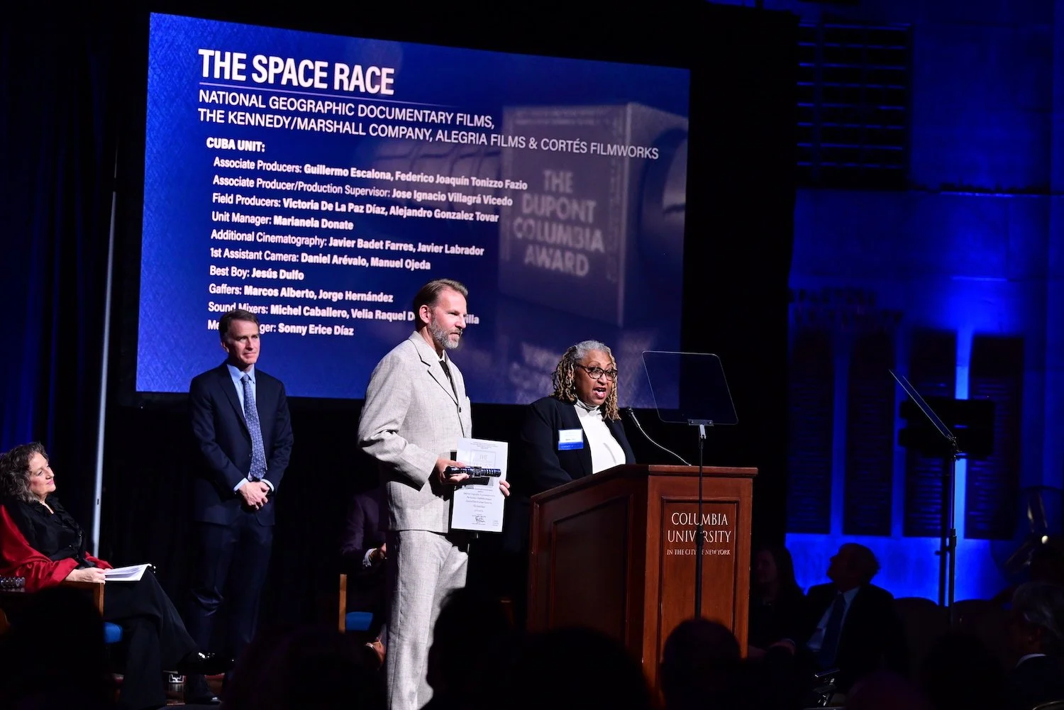 Co-Director Lisa Cortés accepts the duPont Silver Baton, along with Co-Director Diego Hurtado De Mendoza, for the Nat Geo documentary The Space Race.