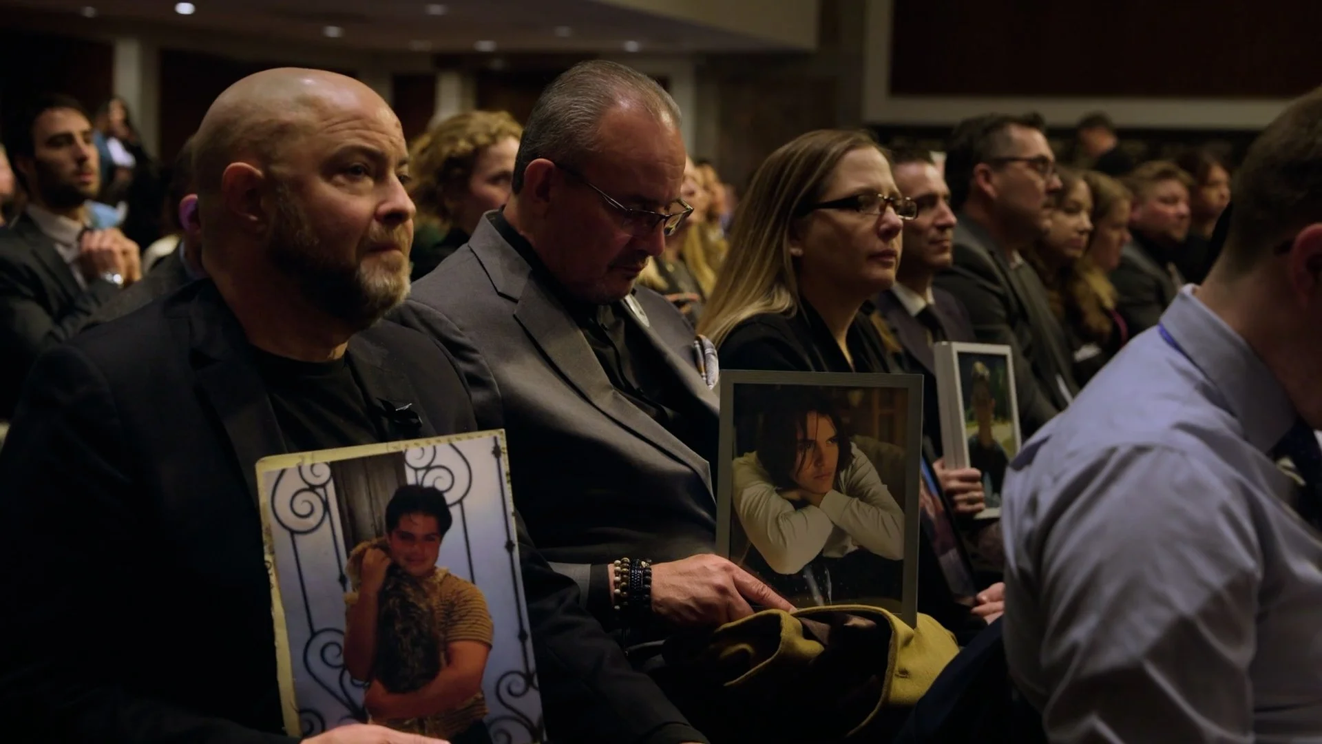 In a scene from “Can’t Look Away,” families at a hearing hold photos of loved ones who they say were victims of these platforms.